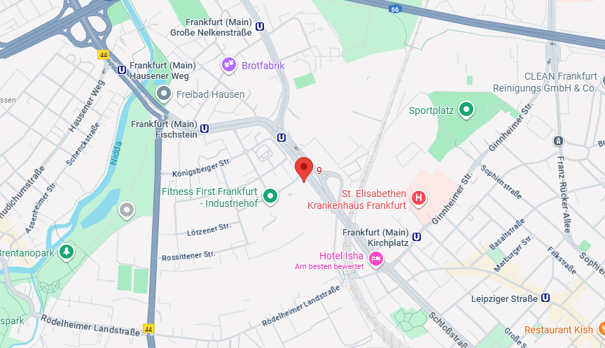 S-Bahn bis Konstablerwache oder Hauptwache, anschließend Umstieg auf U6 Richtung Hausen oder U7 Richtung Praunheim / Heerstaße bis zur Haltestelle Industriehof