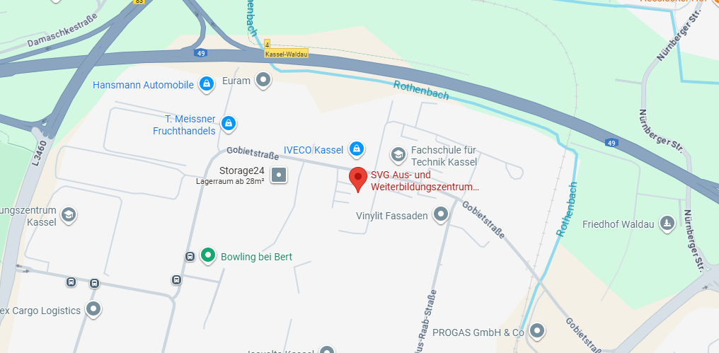 Am Kreuz Kassel-West auf die A49 Richtung Kassel-Stadtmitte auffahren. Ausfahrt 3: Kassel-Waldau abfahren, rechts abbiegen. An der nächsten Ampelkreuzung links in die Falderbaumstraße abbiegen, nach 500m links der Falderbaumstraße folgen und der Vorfahrtsstraße weiterfolgend, kommen Sie in die Gobietstraße. Nach 200m rechts auf den Parkplatz fahren.
